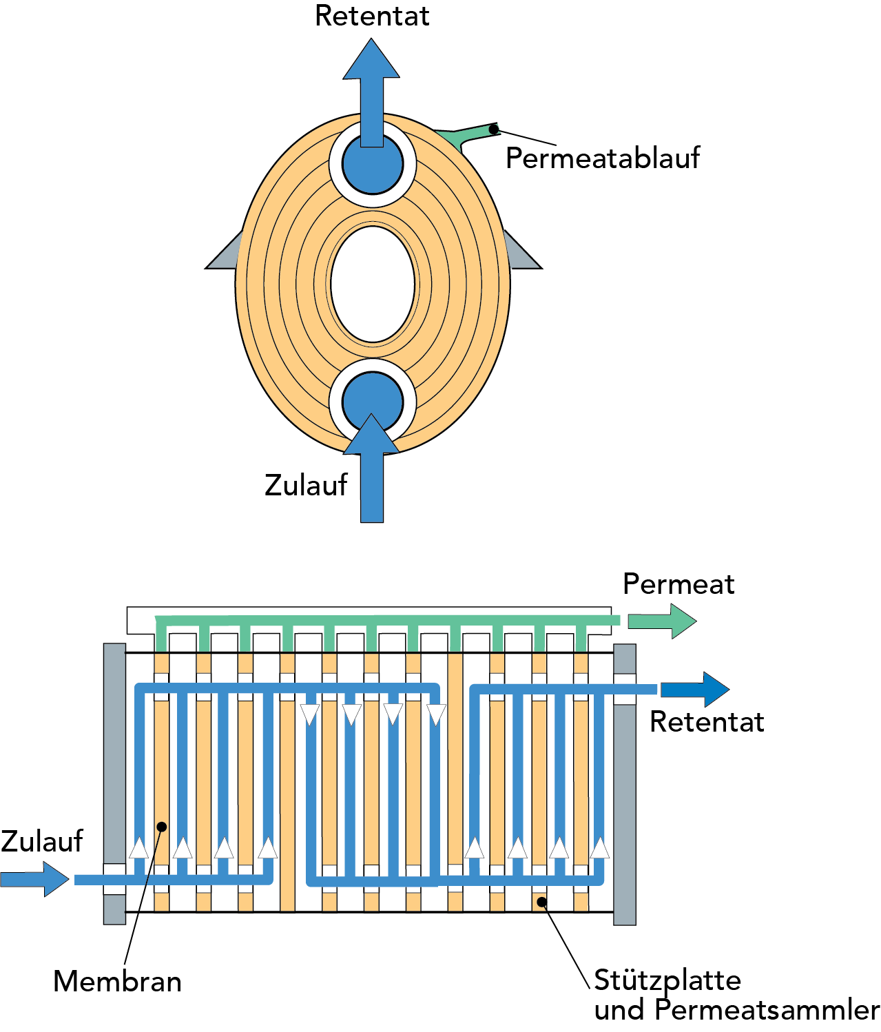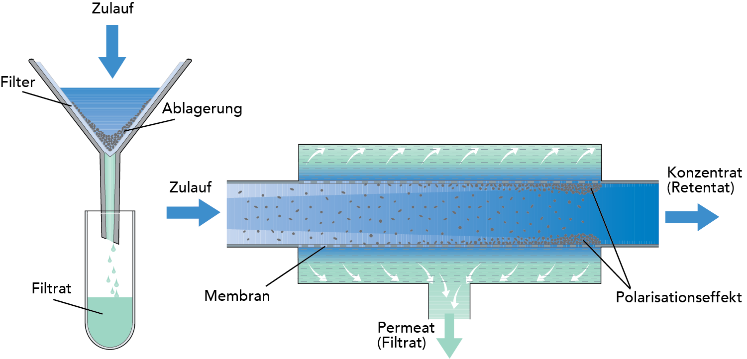Der grundlegende Unterschied zwischen konventioneller Filtration und Querstromfiltration wird in Abb. 6.4.2 veranschaulicht.