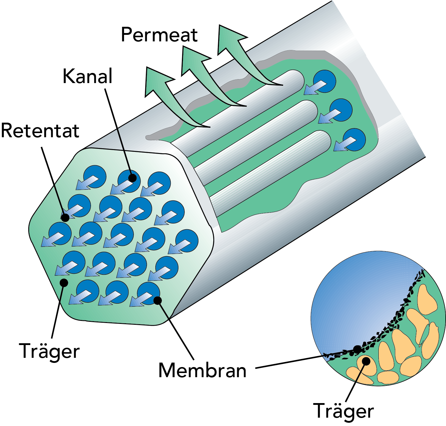 Die dünnen Wandungen der Kanäle bestehen aus feingemahlener Keramik und bilden die Membran. Als Stützmaterial dient grobzerkleinerte Keramik.