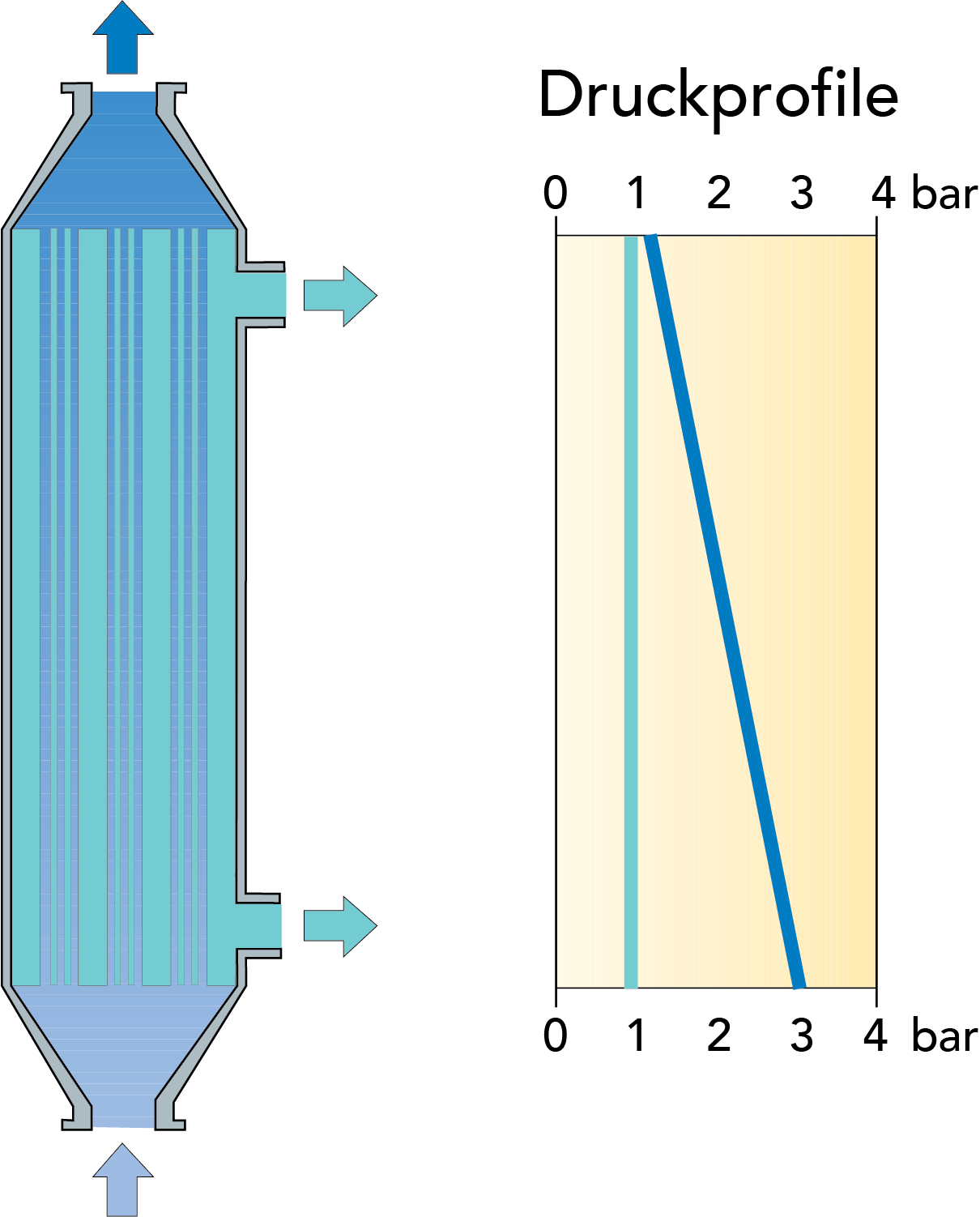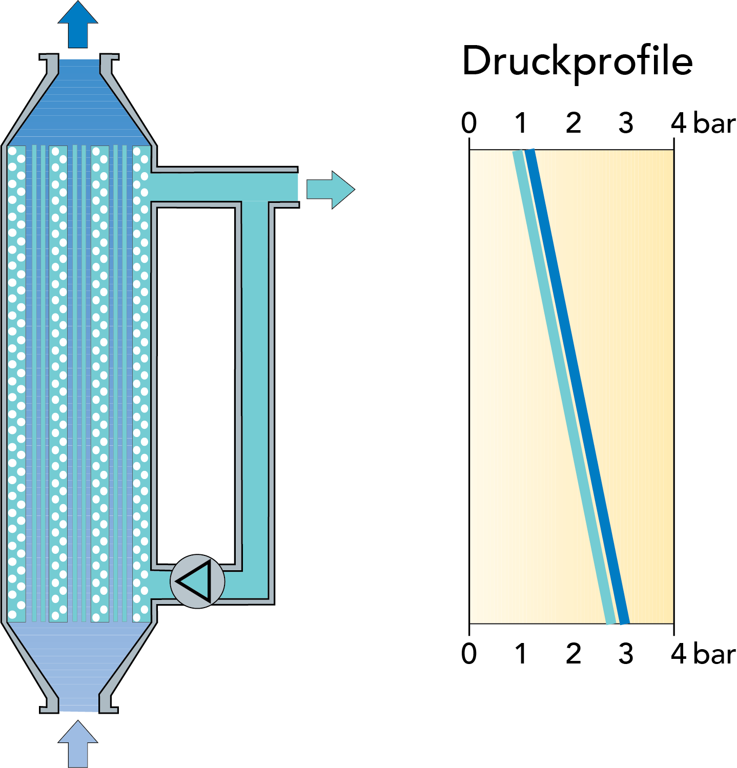 Um optimale Prozessbedingungen über das gesamte Modul hin zu schaffen, wurde ein gleichförmiges Transmembrandrucksystem (Uniform Transmembrane Pressure, UTP) entwickelt. Das in Abb. 6.4.8 gezeigte patentierte System umfasst einen Permeatumlauf mit hoher Geschwindigkeit, wobei das Permeat einen Druckabfall auf der Permeatseite verursacht, der gleich dem Druckabfall auf der Retentatseite ist. Dies gewährleistet einen gleichmäßigen TMD auf der gesamten Membranfläche und damit eine optimale Nutzung der Membranleistung.