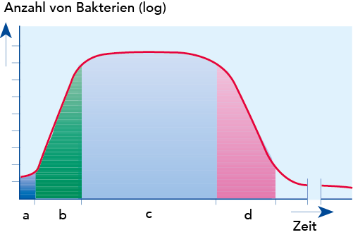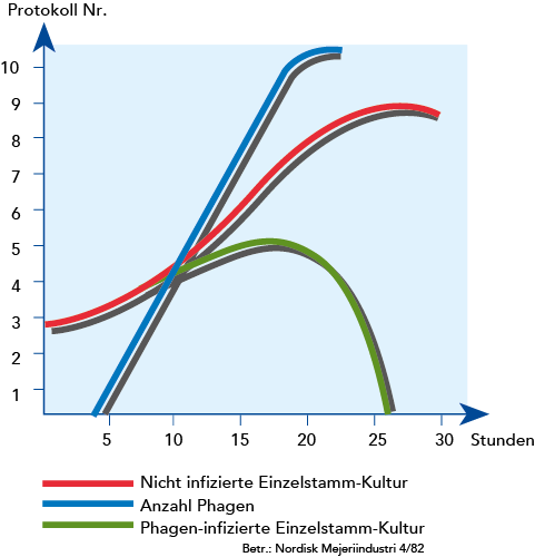Da Rohmilch normalerweise mit Bakteriophagen kontaminiert ist, ist es wichtig, dass Milch, die für Starterkulturen eingesetzt wird (Magermilch) zur Inaktivierung der Phagen für 30 Minuten auf 90 °C erhitzt wird. Abb. 4.29 zeigt, was passiert, wenn dies nicht erfolgt, oder die Milch hinterher mit Phagen rekontaminiert wird. Die Zeit, die ein „nicht infiziertes" Bakterium benötigt, um vier neue Bakterien zu produzieren, entspricht zwei Generationen. Im gleichen Zeitraum infiziert eine Phage ein Bakterium, das innerhalb nur einer Generationszeit 150 neue Phagen freisetzt. Diese Phagen infizieren 150 neue Bakterien und in einer weiteren Generationszeit werden 22.500 Phagen freigesetzt. Dies ist der Grund, warum eine phageninfizierte Starterkultur nach einer Weile plötzlich zusammenbricht.