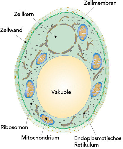 Die Zelle besitzt eine Vakuole, die als Raum für Reservenährstoffe und für Abfallprodukte dient, bevor sie aus der Zelle freigesetzt werden. Fettkügelchen und Kohlenhydratpartikel sind in das Zytoplasma eingebettet. Im Zytoplasma befindet sich zudem ein feines Netzwerk an Membranen (endoplasmatisches Reticulum), Mitochondrien (in denen die Energie für das Zellwachstum erzeugt wird) sowie Ribosomen.