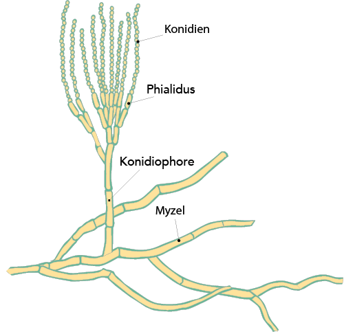 Die asexuellen Sporen, Konidien, stellen die am häufigsten vorkommende Art der Vermehrung beim Schimmel dar. Sie werden in enormer Anzahl produziert. Sie sind sehr klein und leicht und können durch Luftströmungen verbreitet werden, wodurch der Schimmel sich überall verteilt. Dies ist normal, kommt jeden Tag vor, und stellt die Milchindustrie häufig vor Probleme.