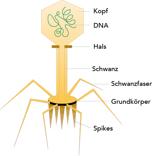 Bakteriophagen oder Phagen variieren stark in der Größe; um sie zu sehen, benötigt man ein Elektronenmikroskop. Eine der größten ist die T-Phage, die Escherichia coli und nahe verwandte Bakterien infiziert. Die T-Phagen haben einen „Kopf" und einen „Schwanz" und eine Größe von 0,03 bis 0,3 μm. Eine schematische Zeichnung einer Phage ist in Abb. 4.26 zu sehen.