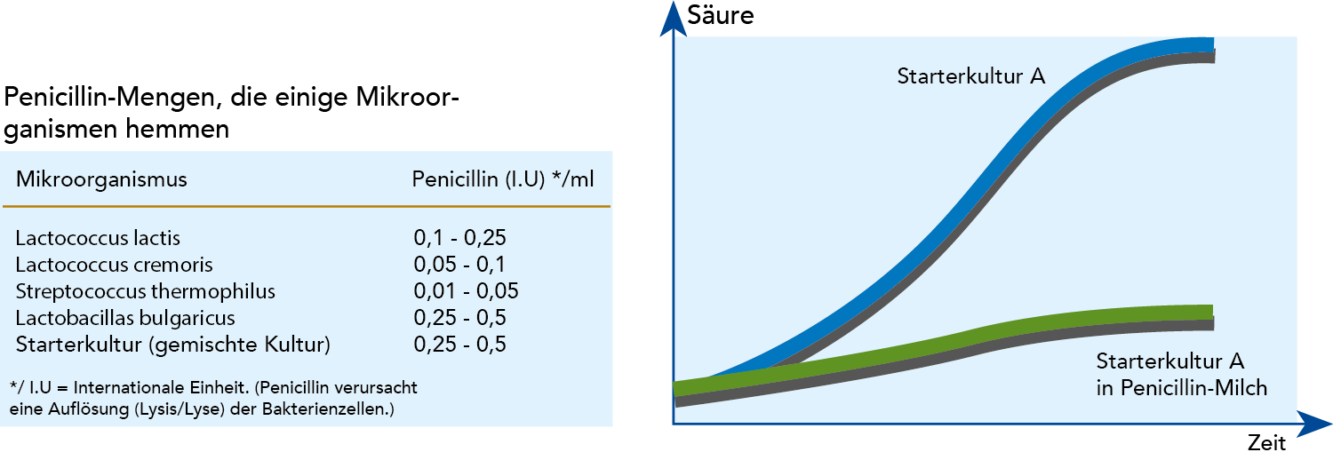 In diesem Zusammenhang sollte erwähnt werden, dass die Milch – durch die Behandlung von unter Mastitis leidenden Kühen – Antibiotikarückstände enthalten kann. Das am weitesten verbreitetste Antibiotika in diesem Zusammenhang ist Penicillin. Ungeachtet der Regelungen, die besagen, dass Milch von mit Antibiotika behandelten Kühen nicht an die Molkerei abgegeben werden darf, findet man ausreichend hohe Mengen an Antibiotika in Milch, die das Wachstum von Starterkulturen stoppen oder verzögern können. Abb. 4.28 zeigt, welchen Einfluss schon geringste Mengen an Penicillin auf die meisten Starterkulturen haben.