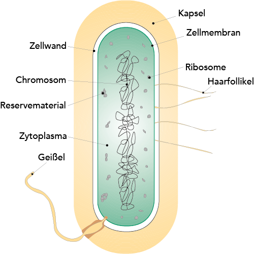 Manche Kokken und Bazillen können sich in einem flüssigen Nährmedium bewegen. Sie treiben sich selbst mit Hilfe von Geißeln an, die wie lange Anhängsel aus der Zytoplasmamembran (Abb. 4.5) wachsen. Die Länge und Anzahl der Geißeln variiert je nach Bakterientyp. Die Bakterien bewegen sich generell bei Geschwindigkeiten zwischen dem Ein- und Zehnfachen ihrer eigenen Länge je Sekunde. Eines der schnellsten ist das Cholerabakterium: es kann in einer Sekunde das 30-fache seiner eigenen Länge zurücklegen.