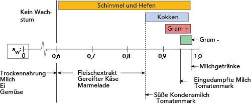 Die meisten der für Lebensmittel relevanten Mikroorganismen haben ihre optimale Wachstumsgeschwindigkeit bei einem aw-Wert von 0,98 oder darüber. Dies ist normalerweise auch die Spanne für den aw-Wert von Milch und Getränken. Verschiedene Gram-negative Bakterien setzen sich aufgrund ihrer Wachstumsgeschwindigkeit durch und dominieren gegebenenfalls die mikrobielle Flora. In Milch beispielsweise verbirgt eine Gram-negative Infektion oft eine Kontamination mit Gram-positiven Bakterien.