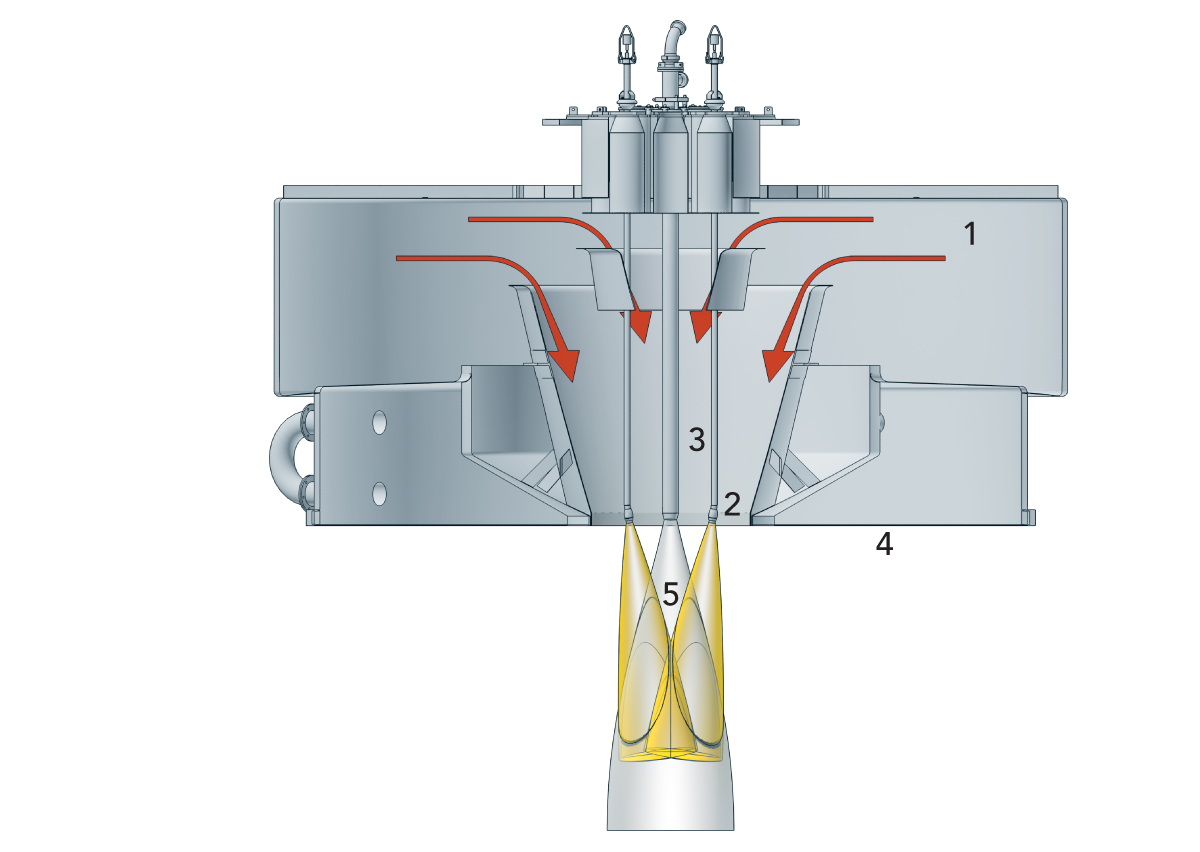 Die grundlegende Funktion der Druckdüsen besteht darin, dass die Druck- energie der Hochdruckpumpe in kinetische Energie in Form eines dünnen Films umgewandelt wird. Die Hochdruckpumpe führt das Konzentrat dem Versorgungssystem der Hochdruckdüsen in einer Hochdruckleitung zu. Das Düsensystem besteht aus mehreren Hochdruckventilen. Diese Ventile versorgen die Lanzen im Luftverteiler des Trockners mit Konzentrat.