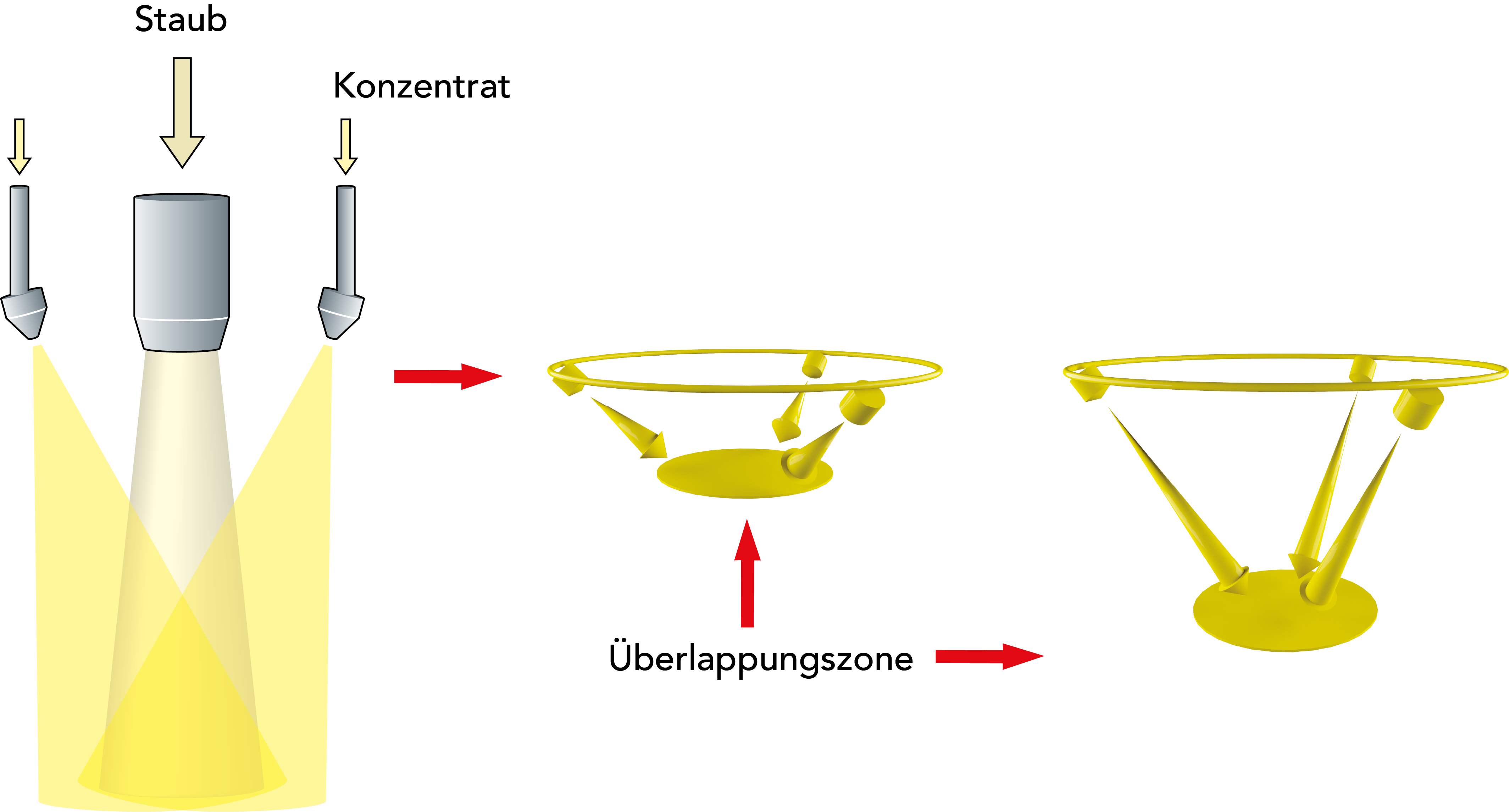 In den meisten Fällen kommt im Agglomerationsprozess ein Multi-Spray- Düsenset zur Anwendung, bei dem sich die einzelnen Sprühströme über- kreuzen. An dieser Kreuzung oder Überlappungszone kommt es zum Kontakt der Staub- und trockenen Partikel. Die Sprühlanzen sind an der Spitze angewinkelt und können zusätzlich nach innen oder außen justiert werden. Die angewinkelte Lanzenspitze ermöglicht das Überkreuzen der Sprühströme, während über das Neigen der Lanzen die Strecke des Trocknungsweges bis zum Überschneidungsbereich variiert werden kann. Die Länge des Trocknungsweges bestimmt die Feuchtigkeit der Sprühtropfen im Überlappungsbereich. So kann die Art der Agglomeration festgelegt werden.