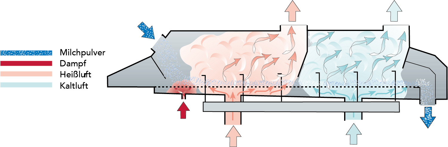 Das Pulver aus dem Sprühturm wird in einer Fließbettanlage weiter getrocknet und gekühlt. Welches System verwendet wird, hängt von der Art des Produktes ab.