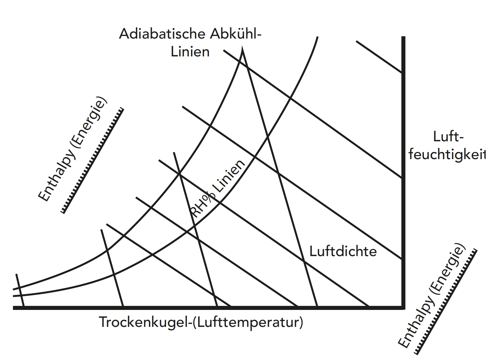 Ein psychrometrisches Diagramm ist die grafische Darstellung der verschiedenen Eigenschaften der Luft, die beim Trocknen eine Rolle spielen. Bei den im Diagramm dargestellten Eigenschaften handelt es sich um die Temperatur, die absolute Luftfeuchtigkeit, die relative Luftfeuchtigkeit (%) und die Dichte der Luft. Das Diagramm wurde entwickelt, um Berechnungen im Rahmen des Trocknens zu erleichtern und die Entwicklung von Trocknern zu unterstützen. Heute stehen Softwareanwendungen zur Verfügung, mit denen sich die Eigenschaften der Luft berechnen lassen. Unter Abbildung 17.2 ist ein einfaches psychrometrisches Diagramm dargestellt.