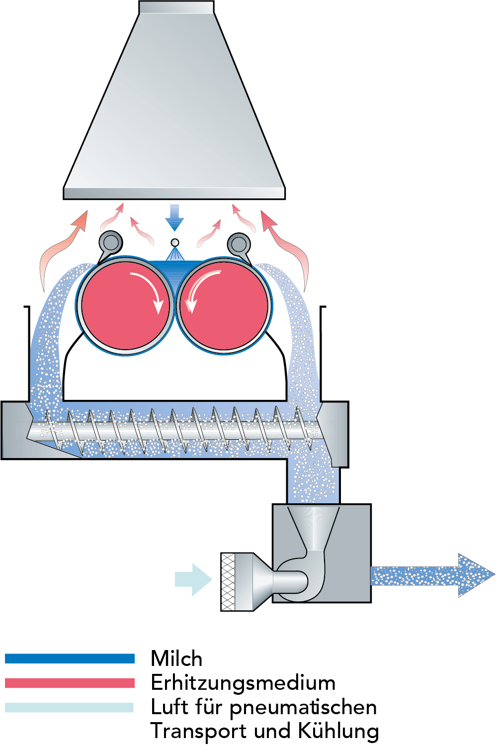 Die Trockenluft wird abhängig vom verfügbaren Erhitzungsmedium und der Art des Produkts auf eine Temperatur zwischen 160 und 230 °C erhitzt. Dann wird sie mittels eines Luftverteilers in den Sprühturm eingeblasen, wodurch eine ideale Verteilung der Trockenluft im Sprühturm erreicht wird.