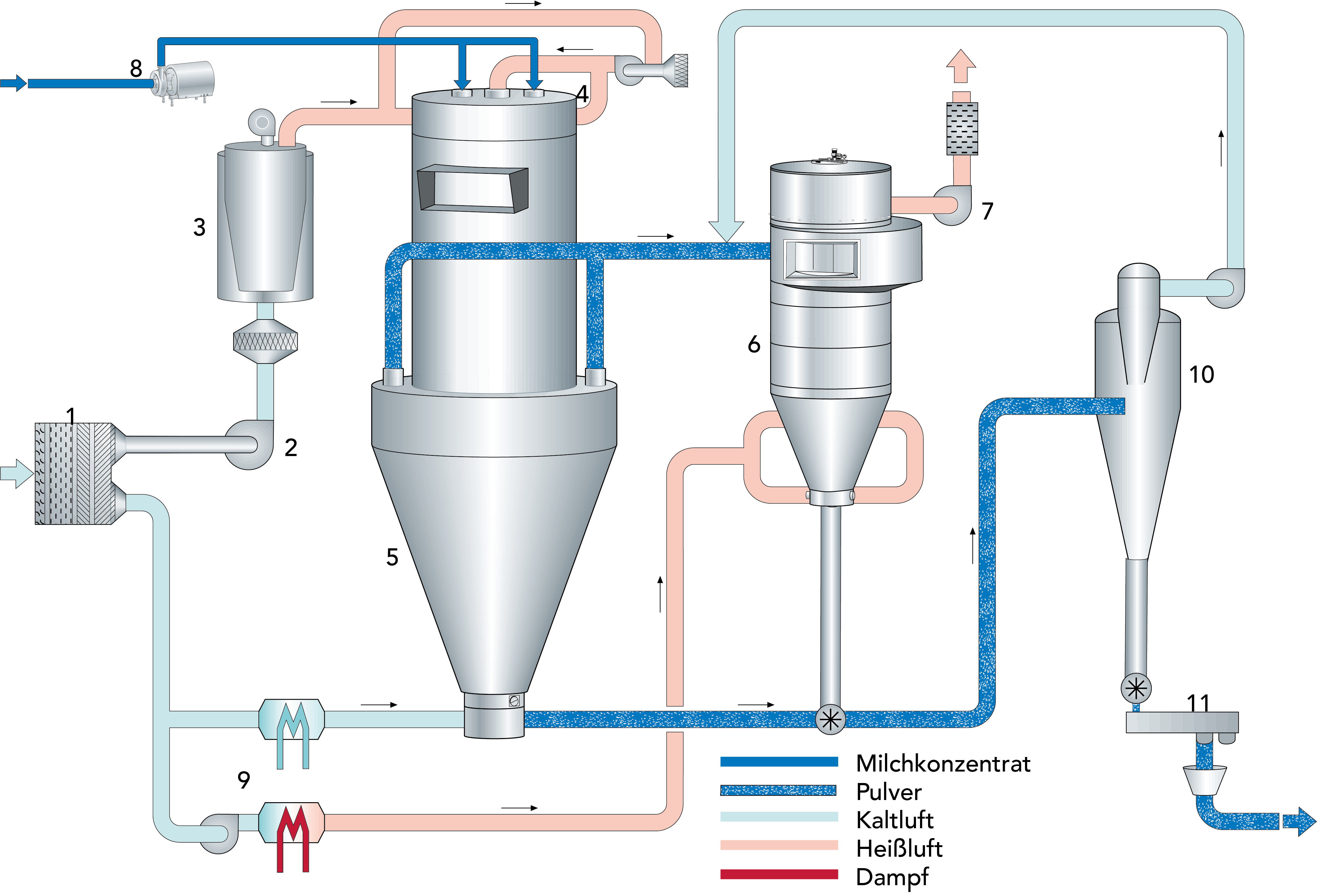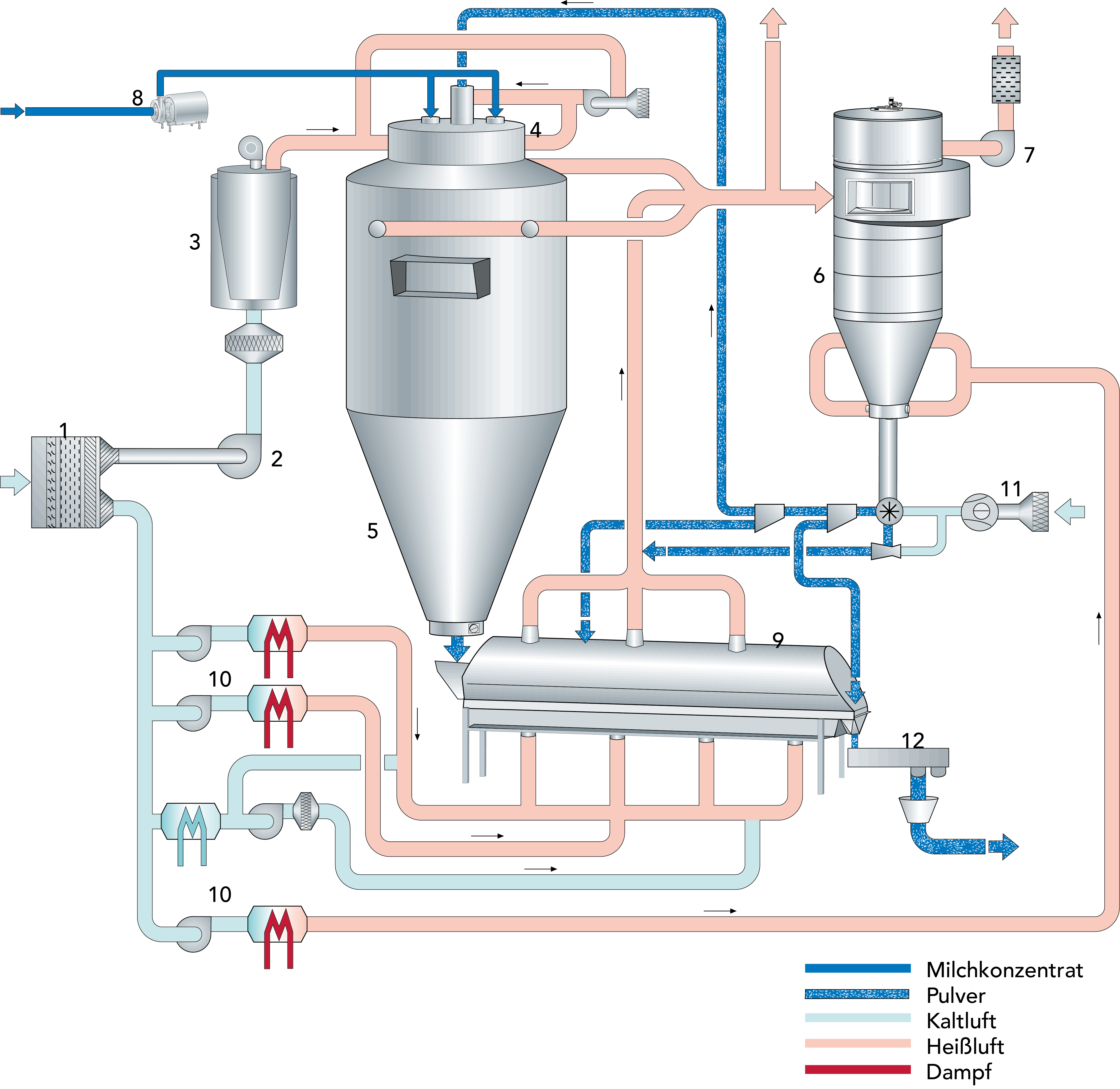 Das klassische System für die Trennung von Pulver und Trockenluft ist ein Zyklon, der auch parallel oder in Reihe betrieben werden kann. Der Reststaubgehalt der Abluft ist sehr hoch, 100 – 200 mg/Nm3. Mithilfe von Schlauchfiltern lässt sich der Reststaubgehalt auf unter 10 mg/Nm3 senken. Diese Art Filter wird mittels regelmäßiger Druckluftstöße entstaubt. Der im Filter anfallende Reststaub kann gewonnen und wieder in den Prozess eingespeist oder im Falle von Babynahrung als Abfall behandelt werden. Als Stand der Technik ist die Verwendung abwaschbarer Filter, die an ein CIP-System angebunden sind, anzusehen. Durch regelmäßige Reinigung wird sichergestellt, dass der Reststaub nicht kontaminiert wird und als Nahrungsmittel erhalten bleibt, wodurch die Ausbeute vergrößert und der Ertrag verbessert wird. Die meisten Milchpulver können ohne Einsatz von Zyklonen hergestellt werden, sofern der Oberflächenbereich des Filters angemessen dimensioniert ist.