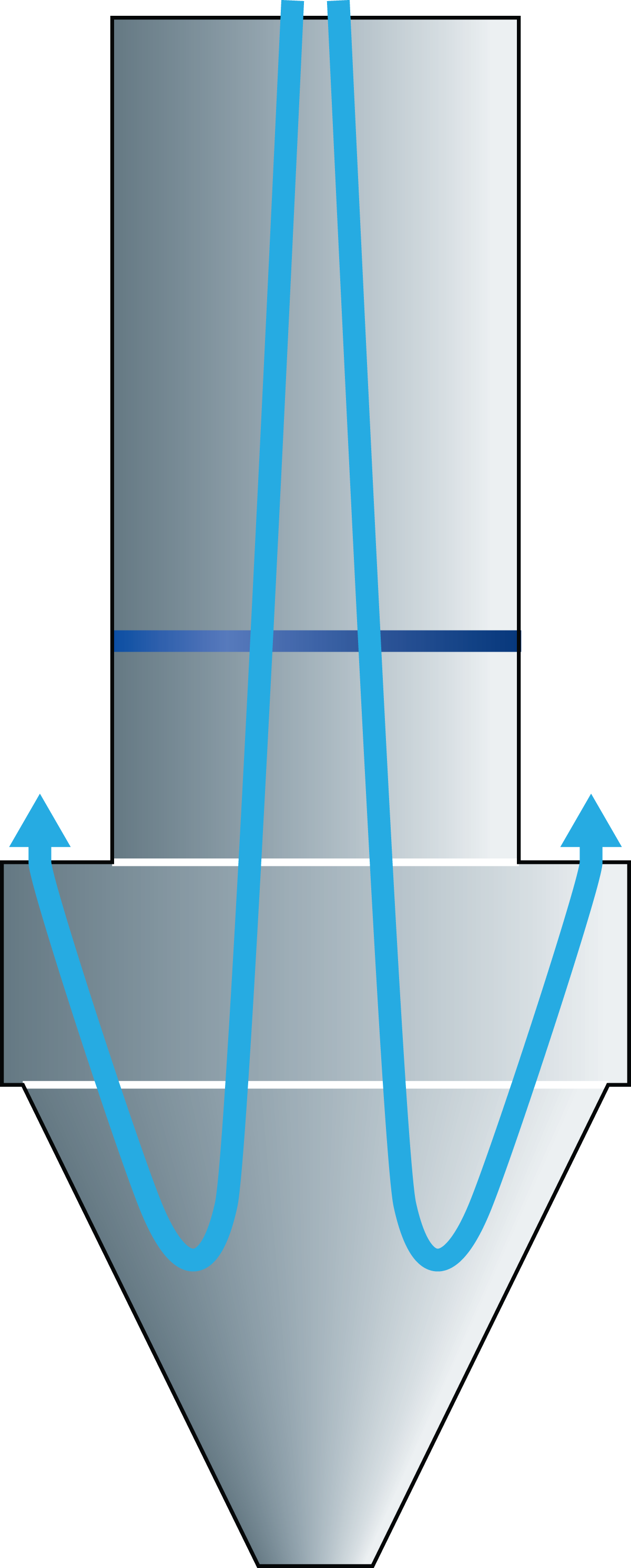 Bei der TFB-Ausführung wird die Abluft an der oberen Seite des konischen Abschnitts über den Kranz abgezogen. Die Luft weist im zylindrischen Abschnitt eine Pfropfenströmung auf und wechselt im konischen Abschnitt die Richtung. Aufgrund des umgekehrten Luftstroms in der Kammer werden grobe Partikel mittels der Schwerkraft von der Luft getrennt und in das Fließbett gefördert. Die feineren Partikel (Staub) werden von der Luft nach oben getragen und verlassen die Sprühtrocknungskammer mit der Abluft über den Kranz (Abb. 17.9).