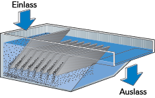 Die Leistung des Sedimentationsbehälters kann gesteigert werden, wenn die Bodenfläche erhöht wird, doch macht ihn dies groß und sperrig. Man kann stattdessen die für eine Separation zur Verfügung stehende Fläche durch Einsatz horizontaler Trennplatten im Behälter vergrößern, wie in Abb. 6.2.9 illustriert.