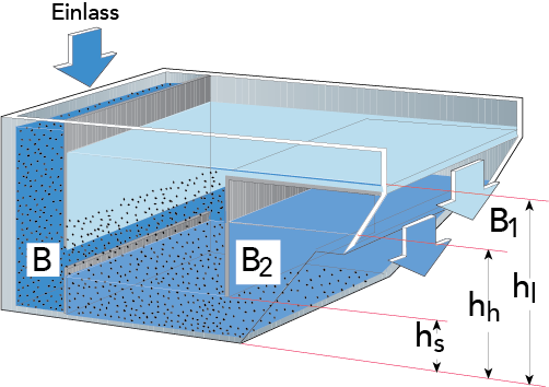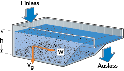 Ein einfacher Behälter für die kontinuierliche Separation von Teilchen ungleichen Durchmessers aus einer Flüssigkeit wird in Abb. 6.2.8 gezeigt. Die Flüssigkeit fließt mit konstanter Geschwindigkeit durch diesen Behälter und verlässt ihn am anderen Ende durch einen Überlauf. Auf dem Weg setzen sich die Teilchen je nach ihrem Durchmesser mit unterschiedlicher Geschwindigkeit ab.