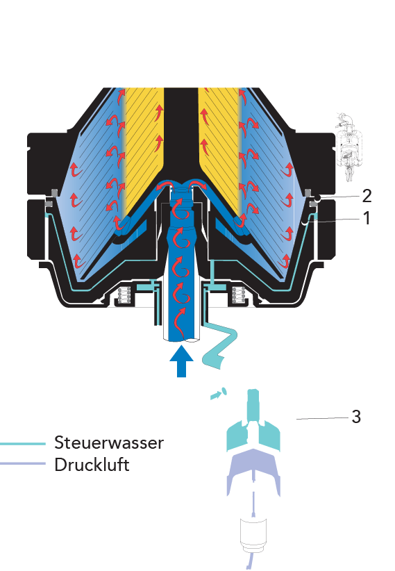 - ein Gegenstrom, mit dem Feststoffe aus dem engeren Ende und Flüssigkeiten aus dem weiteren Ende ausgetragen werden.