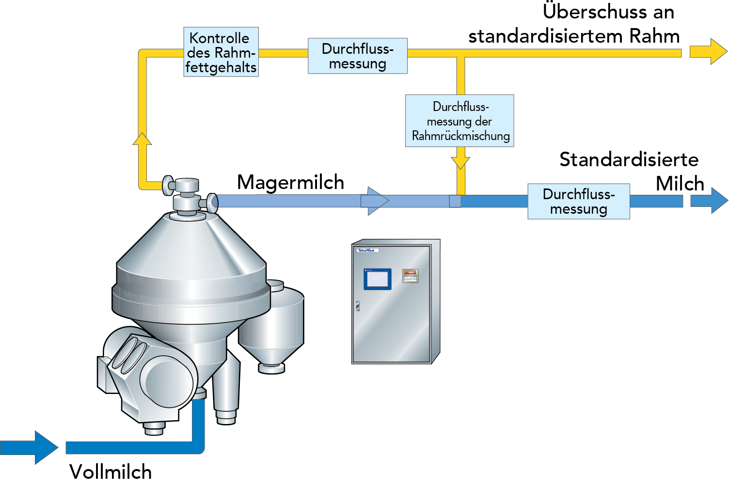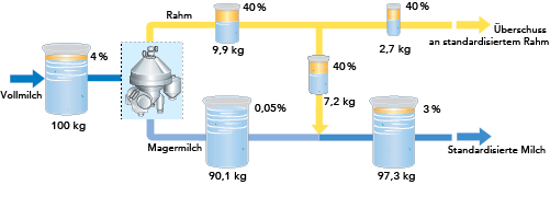 Ist der Fettgehalt der zulaufenden Milch andererseits geringer als der für die standardisierte Milch geforderte, strömt ein berechnetes Magermilchvolumen aus dem Separator und das verbleibende Volumen wird mit dem Rahm gemischt.