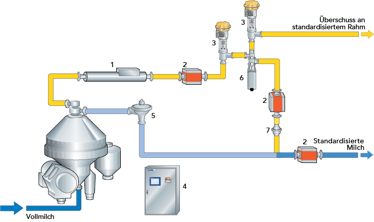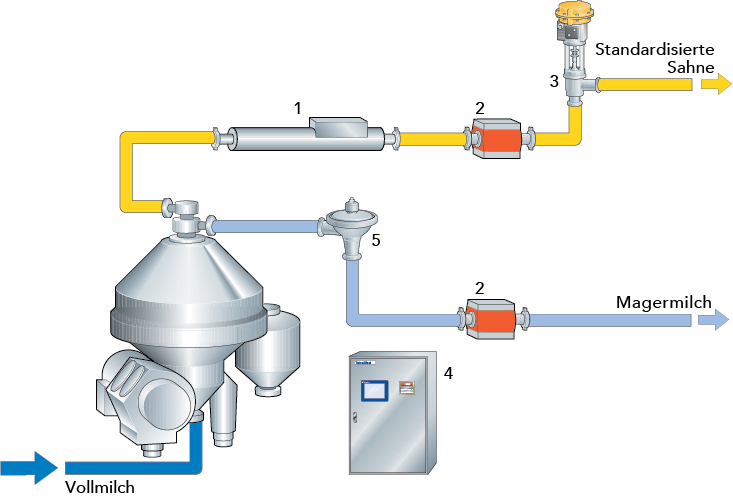 ln Abb. 6.2.35 werden zwei Durchflussmesser gezeigt, die den Durchfluss von standardisiertem Rahm bzw. Magermilch messen. Mit diesen beiden Durchflussdaten errechnet das Kontrollsystem (4) den Zulauf von Vollmilch zum Separator. Ein Dichtetransmitter (1) misst die Rahmdichte und rechnet diesen Wert in den Fettgehalt um. Nach Kombination von Fettgehalt und Durchfluss betätigt die Steuerung das Regelventil (3) und stellt so den gewünschten Rahmfettgehalt ein.
