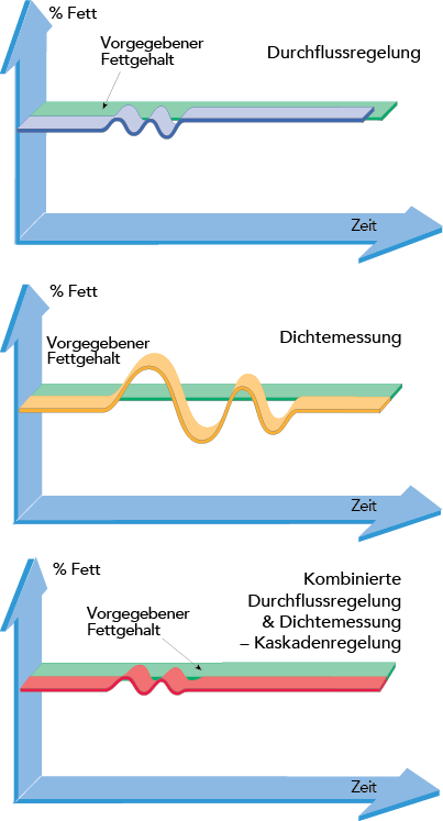 Die Kombination von präzisen Fettgehaltsmessdaten und schnellen Durchflussmesswerten, auch als Kaskadenregelung bezeichnet, bringt, wie Abb. 6.2.36 zeigt, große Vorteile.