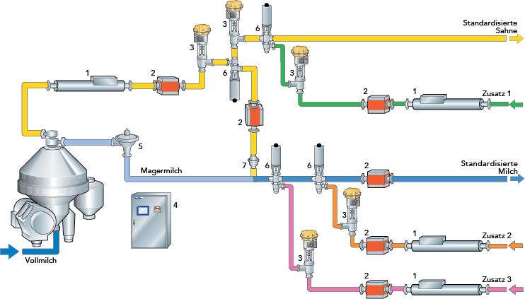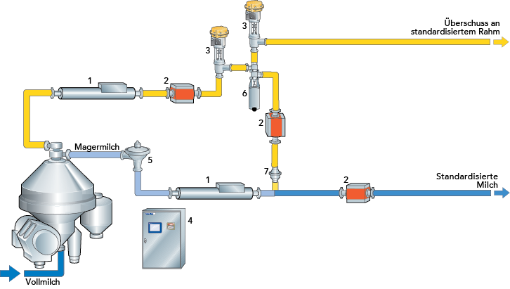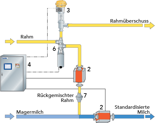 Der Durchflussmesser und das Regelventil in einer Rahmrückmischung sind dieselben, die auch im Regelkreis für die Fettgehaltseinstellung verwendet werden.