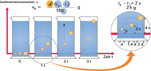 Die obige Formel (Gleichung 1) zeigt, dass die Sedimentations-/Aufrahm- bzw. Auftriebsgeschwindigkeit des Teilchens oder Tropfens