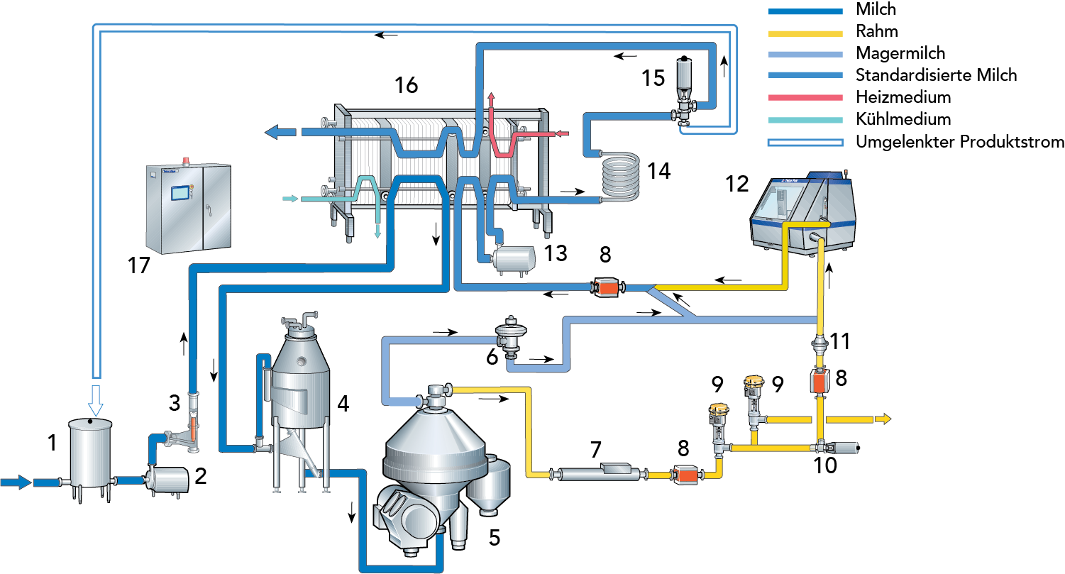 Abbildung 8.1 zeigt den typischen Prozessablauf in einer Trinkmilchlinie. Die Milch kommt über einen Vorlaufbehälter (1) in den Prozess, wird zur Vorwärmung in einen Plattenwärmeaustauscher (16) gepumpt und fließt anschließend zu einem Separator (5) zur Reinigung und Trennung in Magermilch und Sahne.