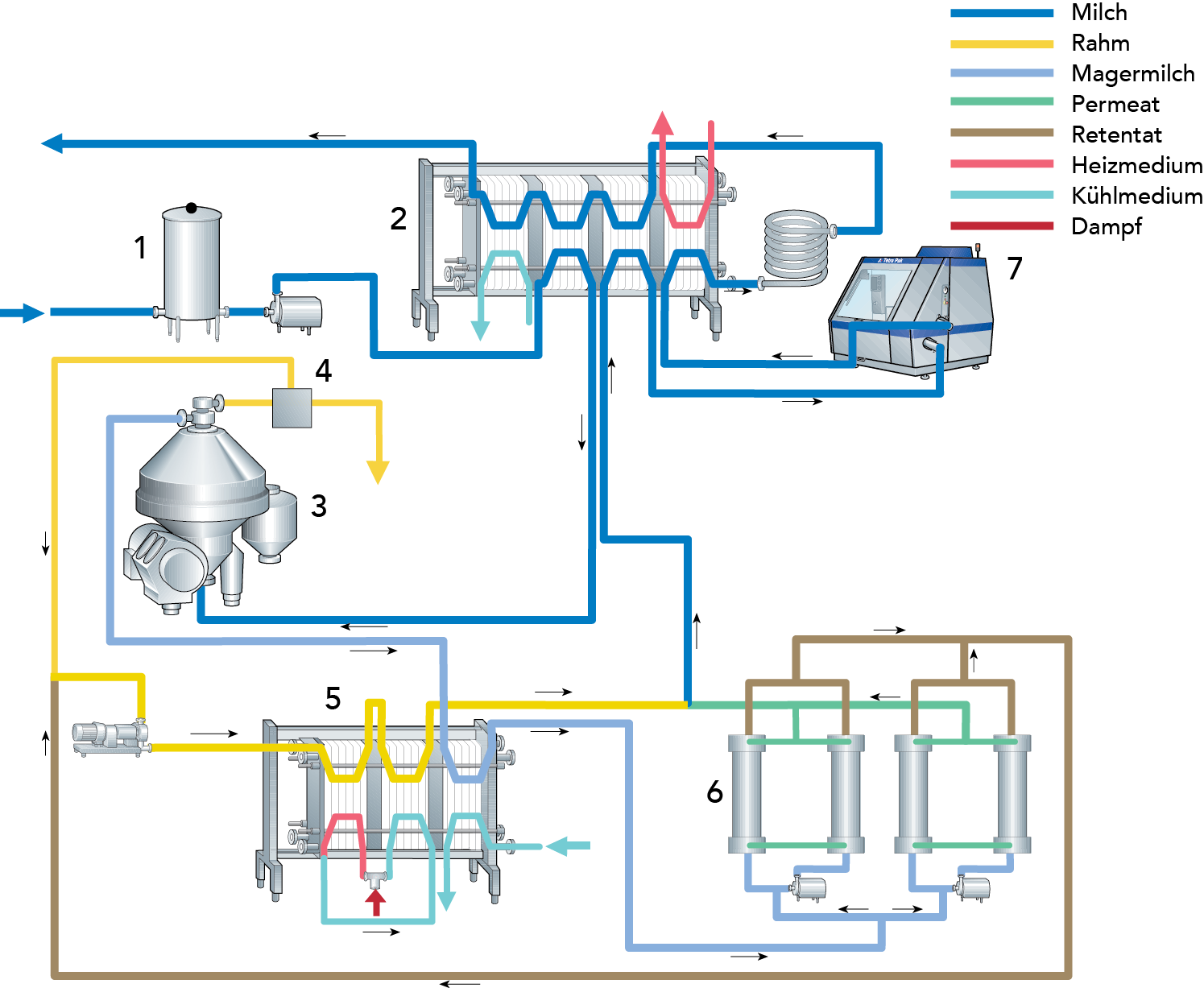 Der einfachste Prozess ist, die Vollmilch zu pasteurisieren. In diesem Fall besteht die Prozesslinie aus einem Pasteur, einem Puffertank sowie einer Abfüllmaschine. Werden verschiedene Trinkmilchsorten, wie z.B. Vollmilch, Magermilch und standardisierte Milch, mit unterschiedlichem Fettgehalt oder Sahne mit verschiedenen Fettstufen hergestellt, wird der Prozess jedoch komplizierter.