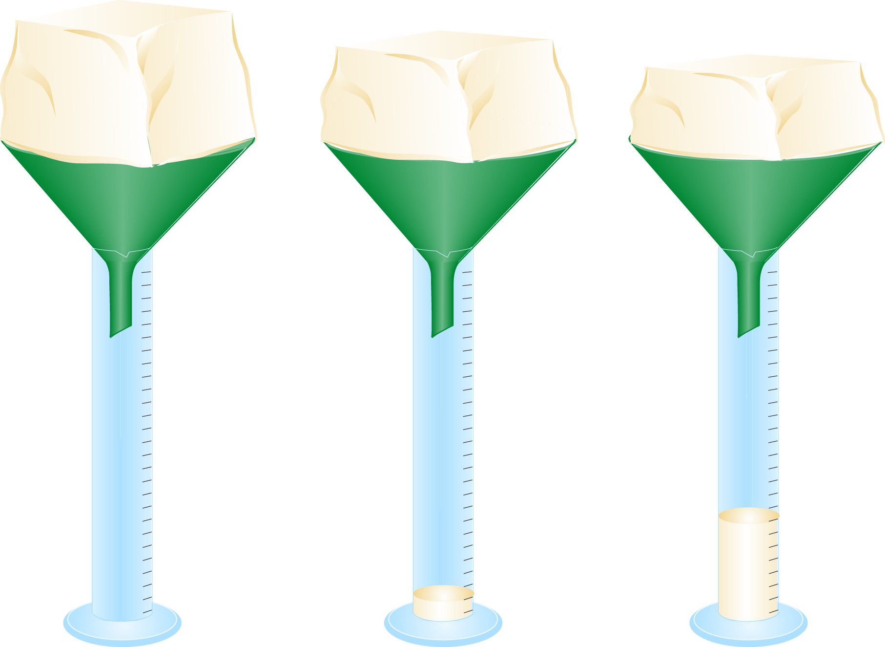 Direkt nach dem Aufschlagen und der Messung des Overruns wird die gesamte Schlagsahne auf einem einfachen Metallnetz platziert. Der Schaum ist entsprechend der Abbildung 8.4 geformt und das Netz wird auf einem Trichter von entsprechender Größe platziert, der in ein skaliertes Messglas eingebracht ist. Nach zwei Stunden Lagerzeit wird die Flüssigkeitsmenge abgelesen, die sich im Glas angesammelt hat. Dies erfolgt bei der oben angegebenen Temperatur und Feuchtigkeit.