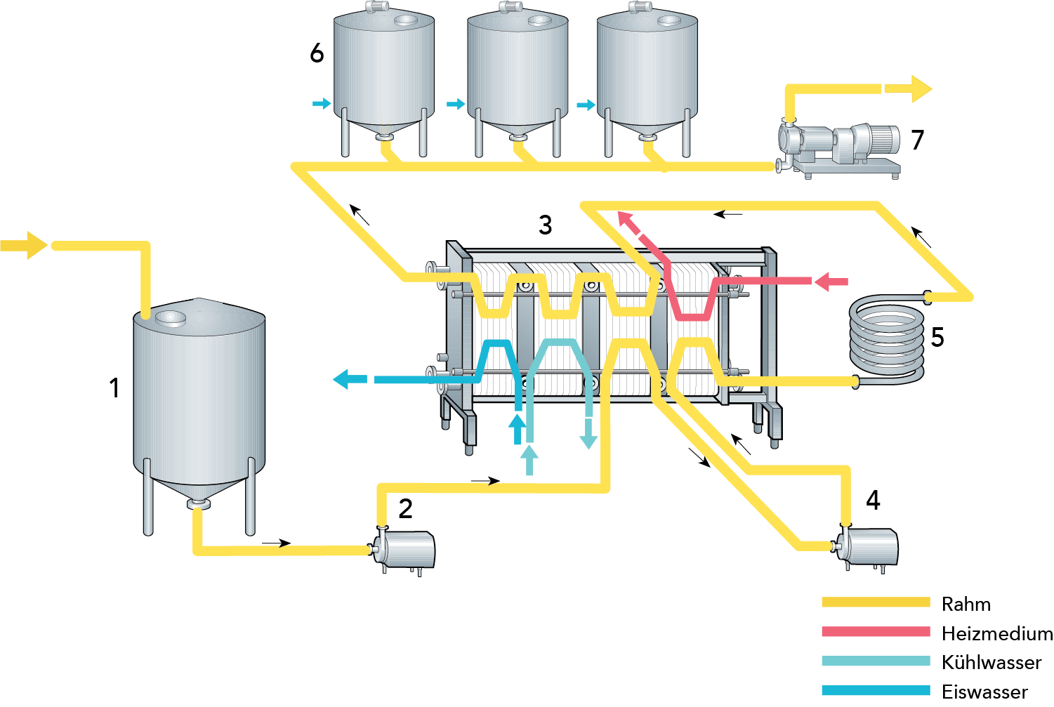 Ein Prinzipschema für eine Pasteurisierungsanlage mit integrierter Mikrofiltration sowie weiteren technischen Anlageneinheiten wird in Abbildung 8.2 dargestellt.