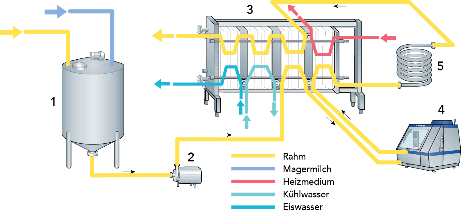 Die standardisierte Sahne wird mit Separationstemperatur einem Heißhaltetank (1) zugeführt. Die optimale Heißhaltezeit in dem Tank beträgt 15 - 30 Minuten, bevor die Pasteurisierung beginnt. Die Durchflussleistung des Rahmpasteurs sollte möglichst der einer durchschnittlichen Zulaufleistung zum Heißhaltetank entsprechen. Dies ermöglicht die Ansammlung kleinerer Mengen an Überschussrahm im Heißhaltetank über eine gewisse Zeitspanne, wodurch eine minimale mechanische Beanspruchung der Sahne sichergestellt wird.