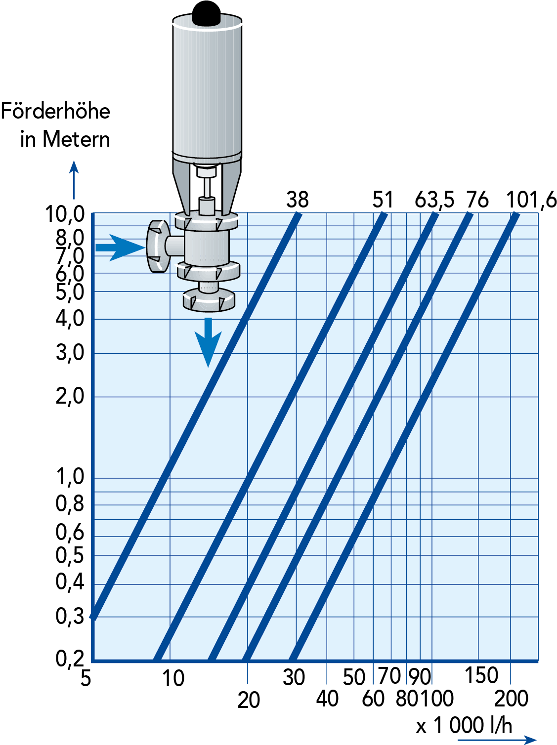 Der Druckverlust einer Komponente wird oft als Verlust an Förderhöhe in Metern für verschiedene Fließgeschwindigkeiten anstatt in Widerstandskoeffizienten angegeben. Die Graphik in Abb. 7.11 umfasst Fließgeschwindigkeiten in einem Absperrventil von 5.000 l/h für die kleinsten Rohrdurchmesser (38 mm bzw. 1,5 Zoll) bis 200.000 l/h für den größten Rohrdurchmesser, (101,6 mm bzw. 4 Zoll).