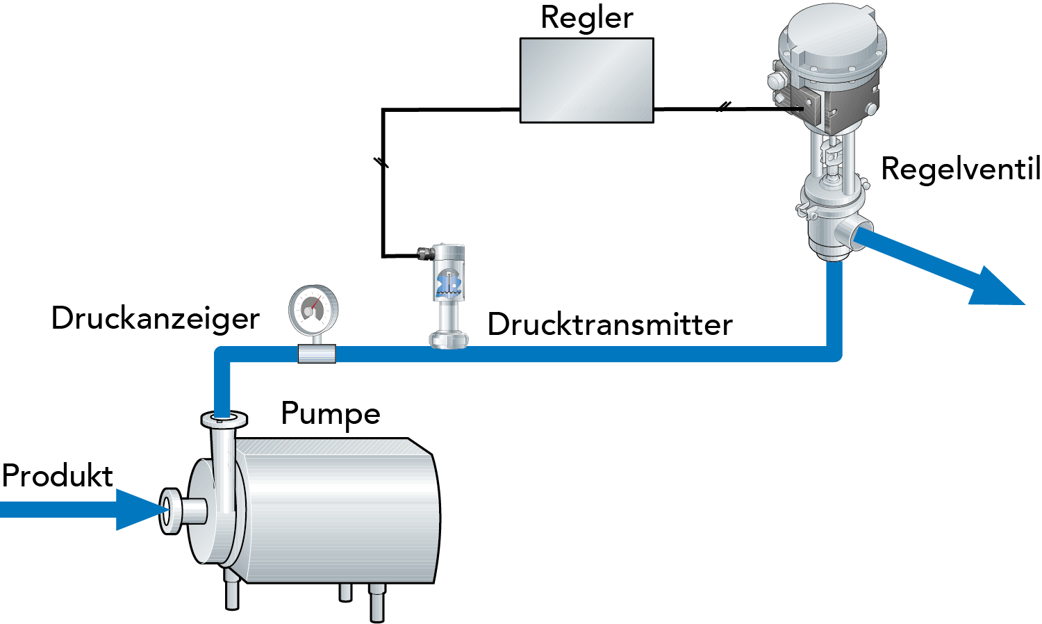 Ein Regler berechnet den Unterschied zwischen Messwert und Sollwert und passt das Signal darauf basierend an das Regelgerät an. Die Einstellung des Regelgeräts ist korrekt, wenn die beiden Werte (Messwert und Sollwert) identisch sind.