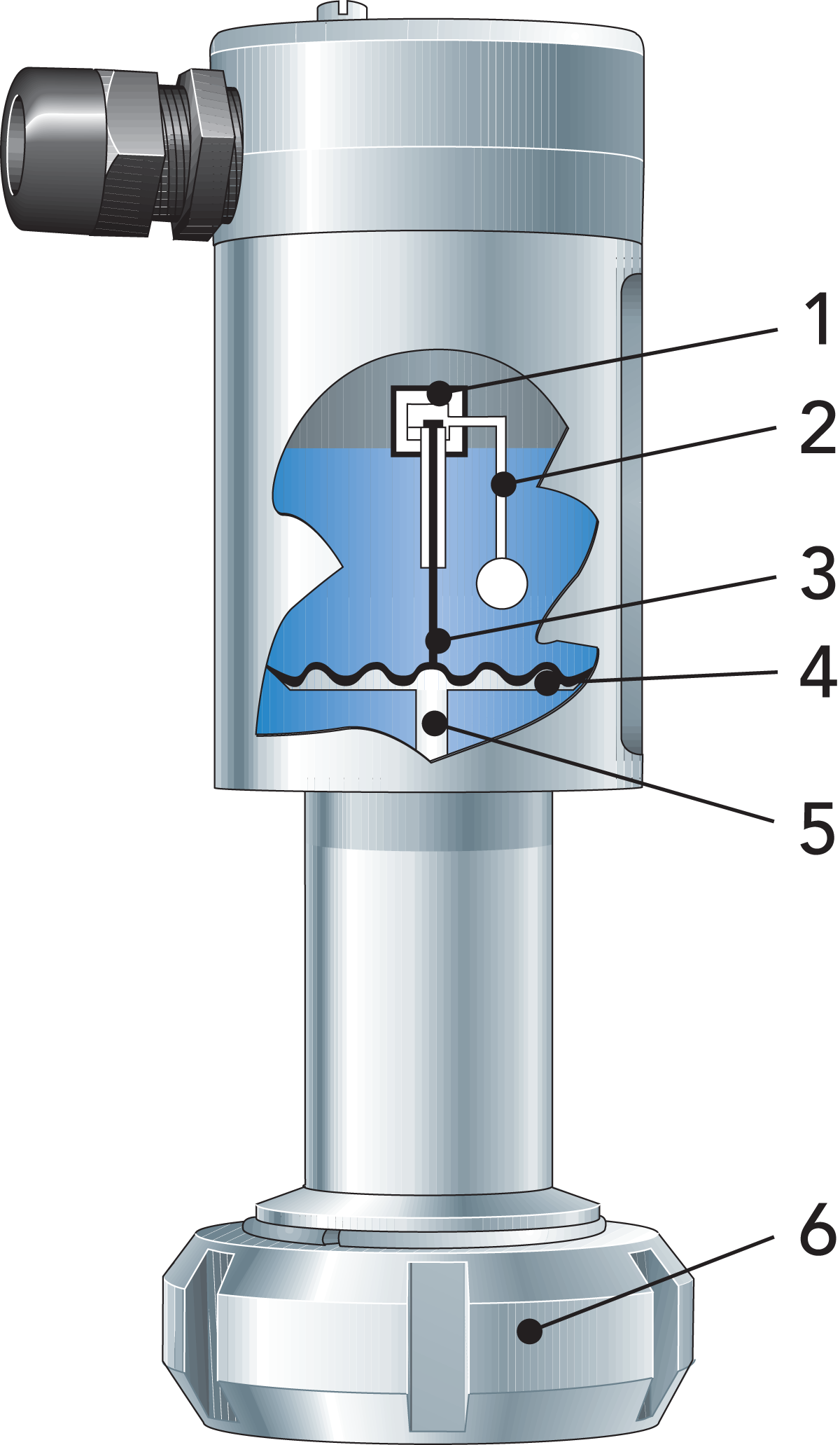 Der vorstehend erwähnte Drucktransmitter kann auch dazu verwendet werden, den Füllstand in einem Tank zu messen. Am Tankboden installiert, misst er den statischen Druck der Flüssigkeitssäule oberhalb der Membran. Dieser Druck ist proportional zur Flüssigkeitshöhe. Das Signal wird an eine Füllstandsanzeige übermittelt.
