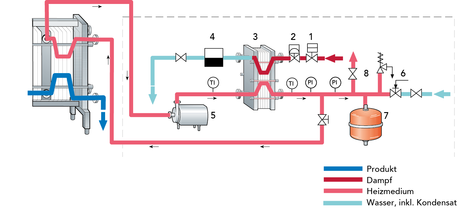 Dampf wird vom Dampfkessel mit einem Druck von 600 bis 700 kPa (6 bis 7 bar) geliefert. Dieser Dampf wird zum Erhitzen des Wassers verwendet, welches wiederum das Produkt auf Pasteurisierungstemperatur erhitzt.