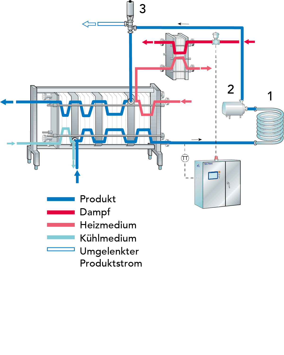 Bevor die Milch den Plattenwärmetauscher verlässt, ist es wichtig, dass sie ordnungsgemäß pasteurisiert wurde. Sinkt die Temperatur unter 72 °C, muss die unpasteurisierte Milch vom bereits pasteurisierten Produkt getrennt werden. Dafür sorgen ein dem Heißhalterohr nachgelagerter Temperaturmessfühler und ein Umschaltventil. Das Ventil (3) in Abb. 7.3 führt unpasteurisierte Milch in das Vorlaufgefäß zurück, wenn der Temperaturmessfühler feststellt, dass die durchlaufende Milch nicht ausreichend erhitzt wurde.