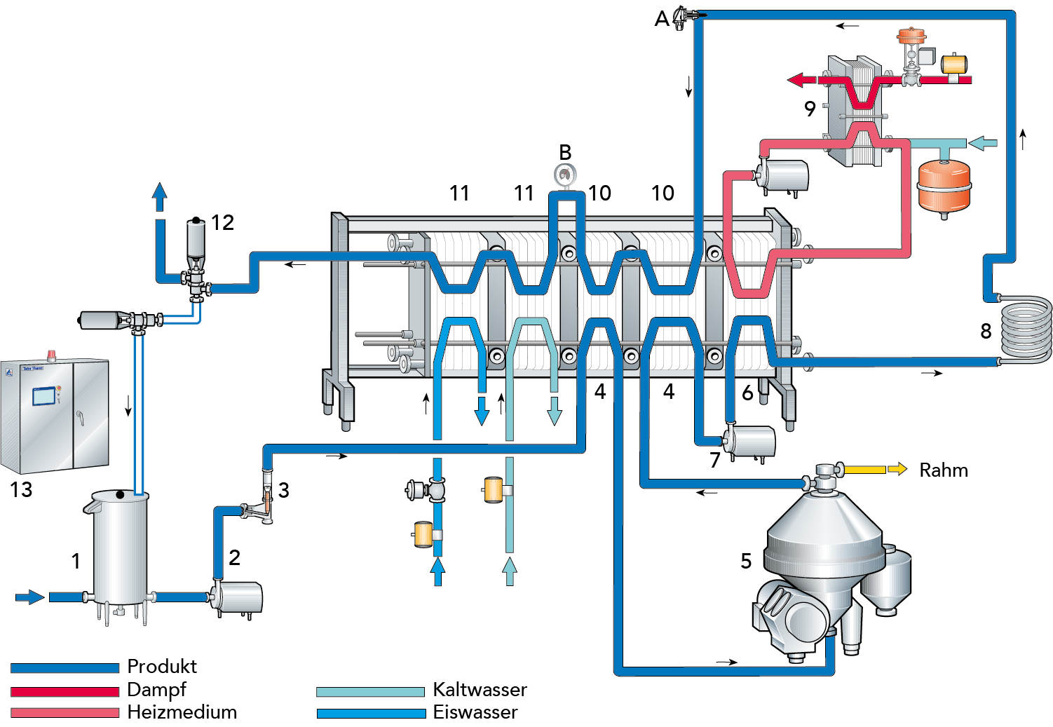 - Klärzentrifuge (da nur Vollmilch behandelt wird, ist bei diesem Beispiel ein Zentrifugalseparator für Entrahmung nicht erforderlich)