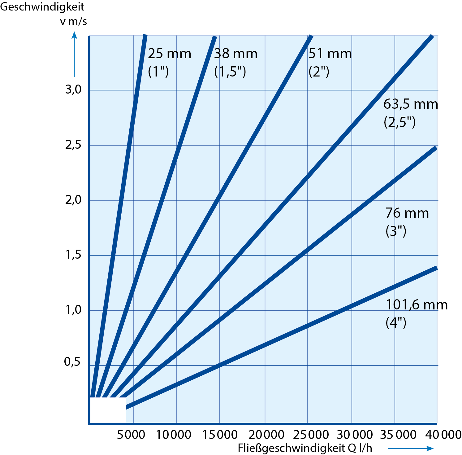Es ist in diesem Fall also ratsam, eine größere Rohrleitung als die vom zulässigen Grenzwert vorgegebene Mindestgröße zu verwenden. Große Rohrleitungen bedeuten aber auch größere Anlagenkomponenten und deutlich höhere Kosten. Deshalb wählt man einen Durchmesser, der möglichst nah am Grenzwert liegt. Im vorliegenden Fall wäre dies der Durchmesser von 63,5 mm (2,5 Zoll), was einer Fließgeschwindigkeit von 1,75 m/s entspricht (vgl. Abb. 7.7).