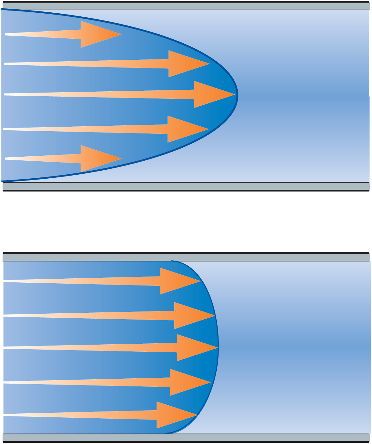Die Rohrlänge repräsentiert die Durchschnittsgeschwindigkeit der Teilchen an verschiedenen Punkten des Strömungsquerschnittes (vgl. Abb. 7.8). Bei laminarer Strömung ist die Geschwindigkeit im Zentrum des Rohrs am größten. Infolge von Reibung zwischen den Flüssigkeitsschichten verringert sich die Fließgeschwindigkeit langsam gegen die Wandung hin, wo sie auf Null zurückgeht.