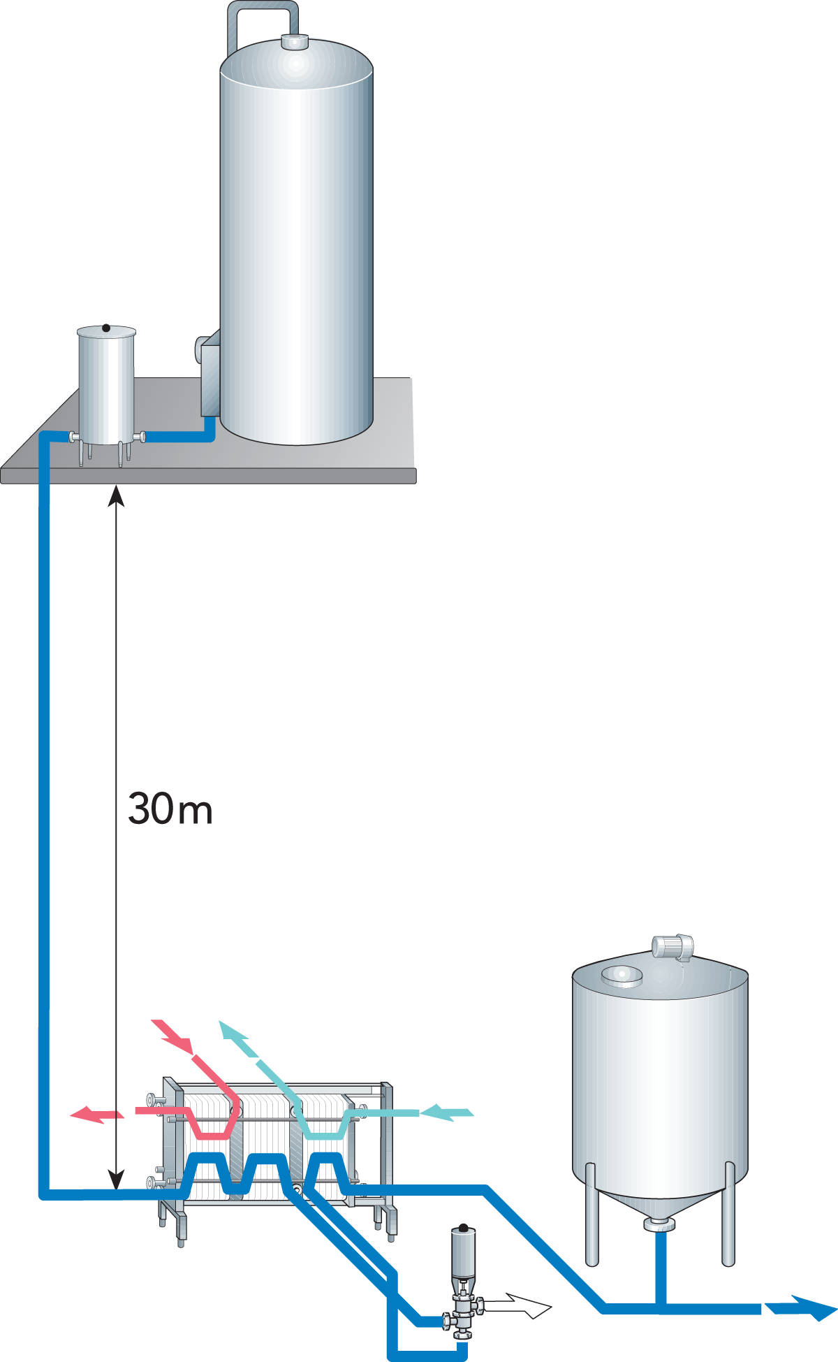 - Das Umschaltventil wird direkt nach dem Heißhalter positioniert. Ist eine Druckerhöhungspumpe installiert, ist das Ventil vor der Pumpe platziert. Unterschreitet die Temperatur den eingestellten Sollwert, lenkt das Umschaltventil den Produktstrom zum Vorlaufbehälter zurück und die Pumpe wird angehalten. Der Produktstrom in den Wärmeaustausch- und Kühlabteilungen kommt folglich zum Erliegen (selbst wenn keine Druckerhöhungspumpe eingebaut ist).