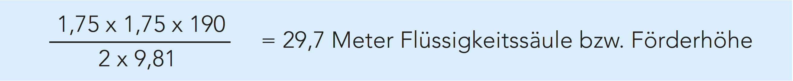 Beispiel: Die Produktgeschwindigkeit in einem Rohrleitungssystem beträgt 1,75 m/s (Rohrdurchmesser 2,5 Zoll bei einem Durchsatz von 20.000 l/h). Die Summe der Widerstandskoeffizienten beträgt 190. Der Fließwiderstand des Systems beträgt demnach:
