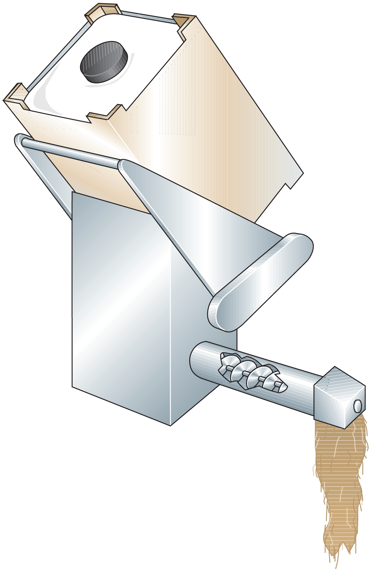 Pulver kann alternativ auch in Containern angeliefert werden. In diesem Fall beinhaltet die Prozesslinie einen Schneckenförderer mit variabler Drehzahl- regelung, der das Pulver vom Boden des Behälters aufnimmt und in den Mischer fördert. Der Container kann dabei über eine Kippvorrichtung oder einen Kran in Position gebracht werden (vgl. Abb. 18.2).
