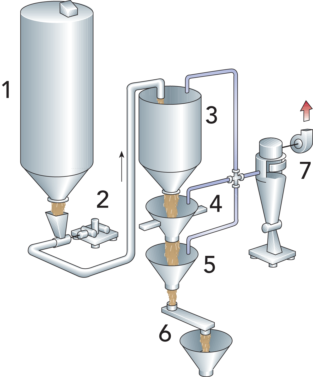 In hochautomatisierten Anlagen wird das Pulver als sogenannte „Bulkware" (Massenware in Großgebinden) angenommen. Es wird in Silos gelagert und pneumatisch zu einem Tagesvorratsbehälter gebracht. Von dort geht es über einen Wiegetrichter und einen Schneckenförderer in den Prozess. Das in Abb. 18.3 gezeigte System beinhaltet eine zentrale Staubabscheidung.