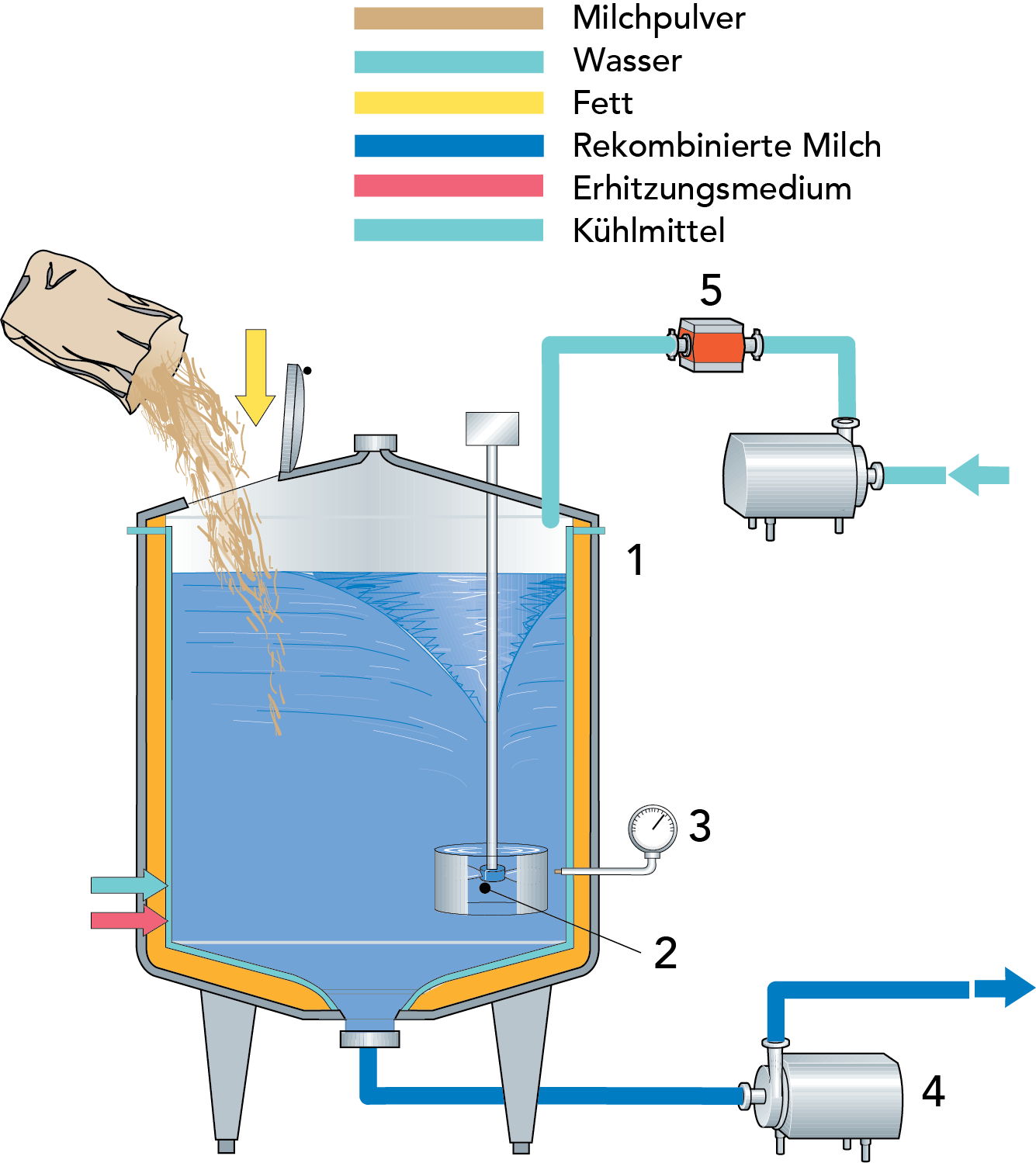 Wasser von Trinkwasserqualität wird in einem der Mischtanks (4) vorgelegt. In der Zufuhrleitung wird es über einen Plattenwärmetauscher bereits erwärmt, da sich Magermilchpulver leichter in warmem als in kaltem Wasser auflöst.