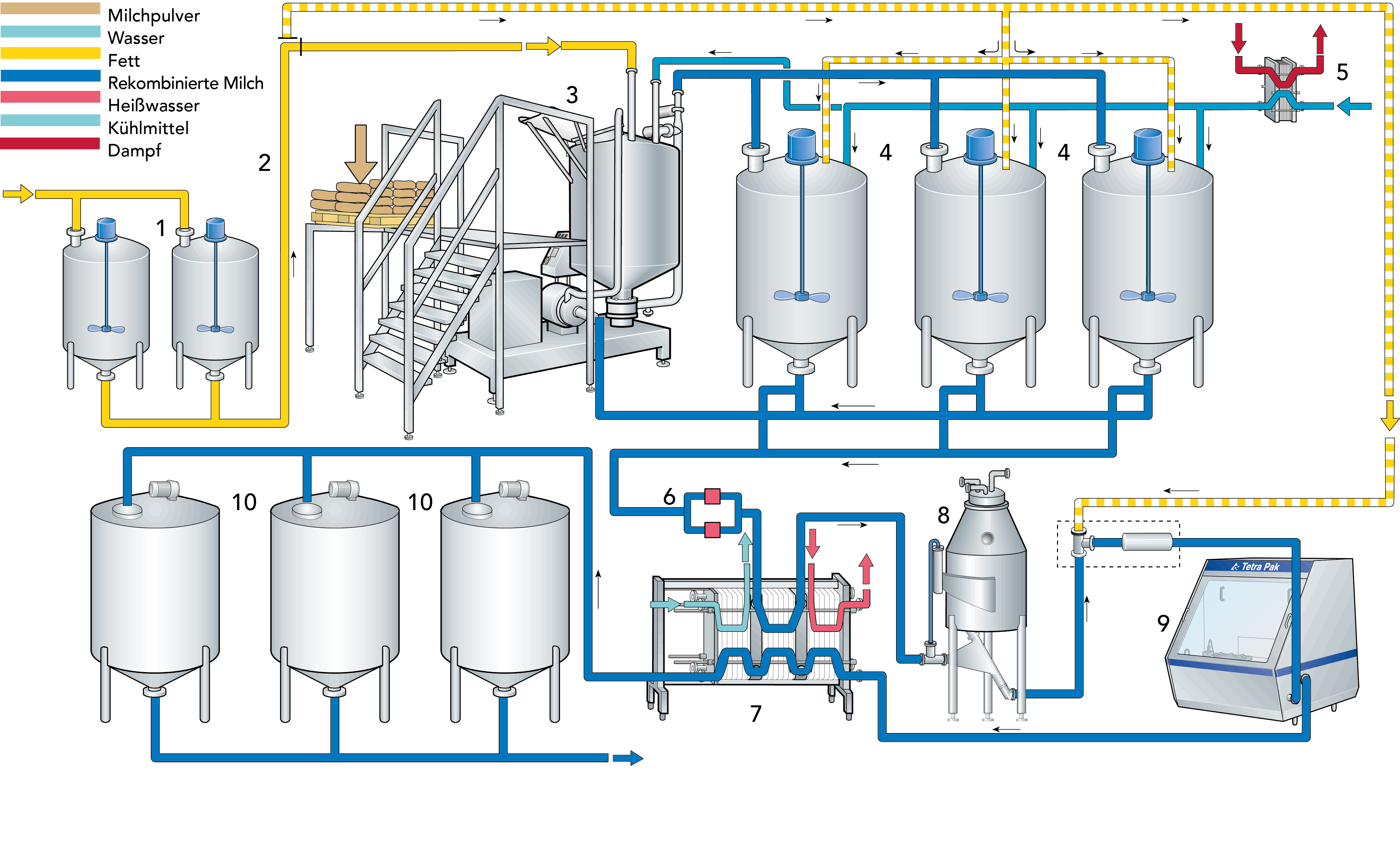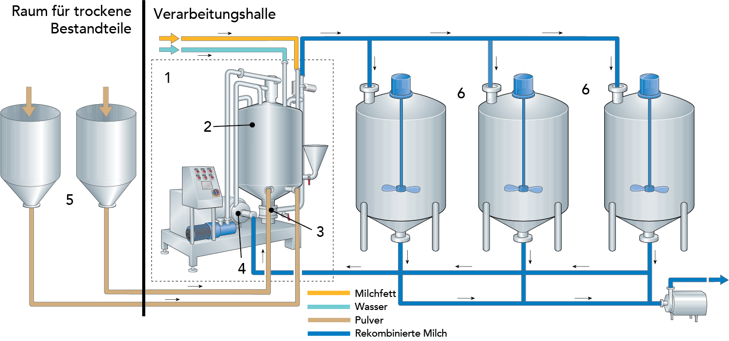 Ähnliche Systeme können auch bei der Herstellung von rekombinierten abgefüllten Milchprodukten verwendet werden, wenn Pflanzenfette zugesetzt werden sollen.