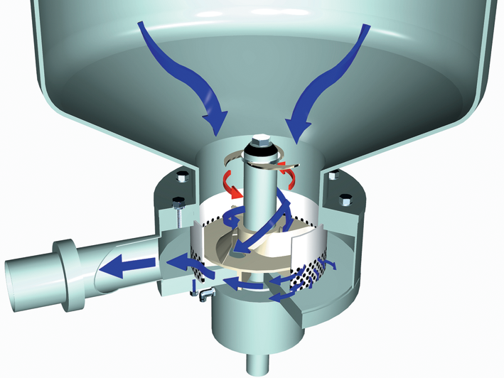 Das Herzstück des Mischsystems ist die Turbomischeinheit, die in dem Boden des Mischtanks angeordnet ist. Die Turbomischeinheit, die aus einem Rotor sowie einem perforierten Stator besteht, wird zum Mischen, Pumpen und Dispergieren eingesetzt. Die Zusätze und die Flüssigkeit werden über ein Pumpenrad in die Mischeinheit gesaugt und mittels des unterhalb des Pumpenrads angebrachten Kreiselpumpen-Flügels durch die Löcher des perforierten Statorringes gepresst. In dem perforierten Stator sorgen sehr hohe Scherkräfte für eine effektive Auflösung und Verteilung der Zutaten. Da sich der Auslass des Mischers direkt an die Mischeinheit anschließt, müssen alle zugegebenen Zutaten diese Turbomischeinheit passieren.