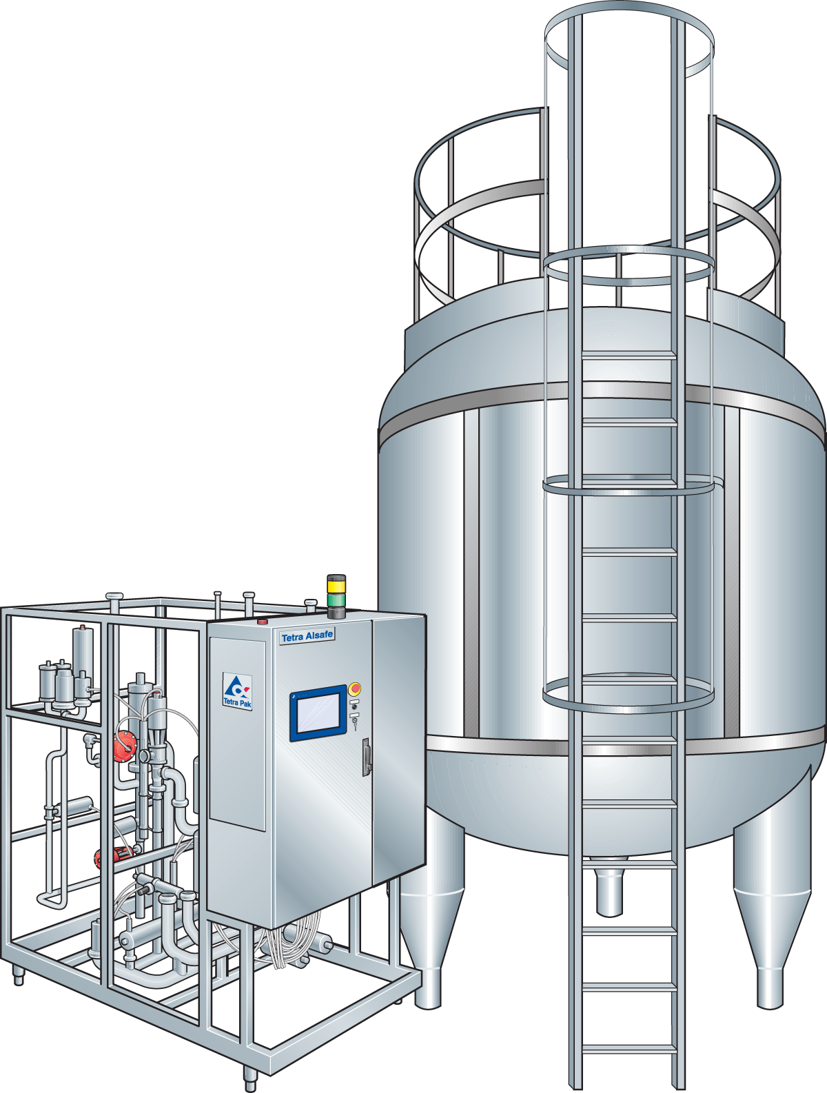 Rekombinierte Milch fließt i. d. R. von der Herstellung direkt zur Abfüllung. Um zeitweise Stopps der Abfülllinie auszugleichen, kann ein Puffertank erforderlich werden. Bei UHT-Milch muss dieser Puffertank aseptisch ausgeführt sein (Abb. 18.8), um das Risiko einer Rekontamination auszuschließen.