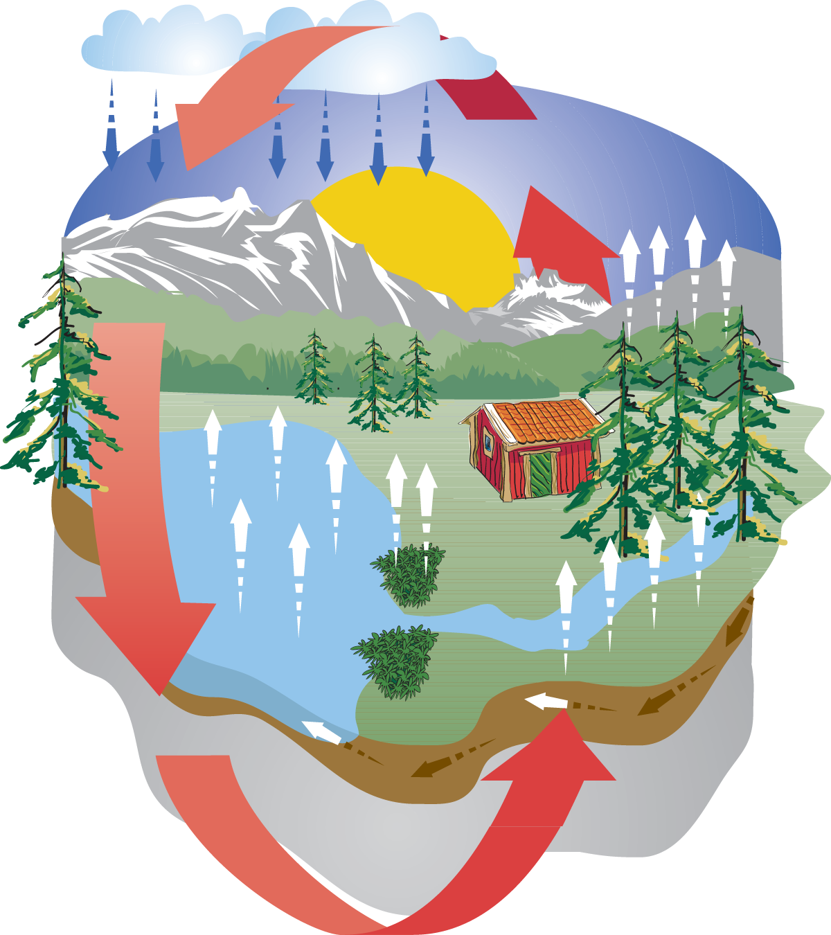 Wasser folgt in der Natur einem ständigen Kreislauf (Abb. 6.11.1). Von der Sonne aufgeheizt, verdampft es von den Oberflächen der Ozeane, Meere und Seen. Das Wasser wird durch Wolken in der Luft gehalten und mit dem Wind über Land getragen, wo es sich abkühlt, kondensiert und als Regen, Hagel oder Schnee niederschlägt. Ein Teil des Oberflächenwassers strömt vom Boden direkt in Seen und Flüsse und so zurück ins Meer. Der Rest versickert durch die oberen Schichten des Erdbodens und wird zu Grundwasser.