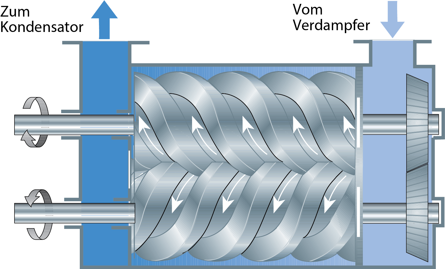 Heutzutage werden oft auch Schraubenkompressoren (Abb. 6.11.12), insbesondere für höhere Leistungen, verwendet. Ihre Hauptbauteile sind zwei in einem gemeinsamen Gehäuse eingebaute schraubenförmige Rotoren. Bei der Umdrehung der Rotoren wird Gas in die Hohlräume zwischen der Verzahnung (vgl. dazu auch den Abschnitt über Verdrängerpumpen im Kapitel 6.7) gezogen und in den Zwischenräumen eingeschlossen. Das Volumen zwischen der Verzahnung wird entlang der Rotoren kontinuierlich verringert, sodass das eingeschlossene Gas schrittweise komprimiert wird und der Druck ansteigt. Der komprimierte Dampf wird weiter in den Kondensator befördert. Um Leckagen zwischen den Hohlräumen der Rotoren zu reduzieren, wird bei den meisten Schraubenkompressoren Öl auf die Gitterstrukturen gesprüht. Damit lässt sich auch bei geringen Umdrehungszahlen ein hoher Wirkungsgrad erreichen. Das Öl wird vor dem Kondensator über einen Ölabscheider aus dem Dampf entfernt.