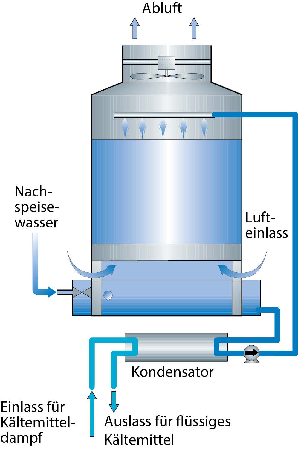 Der wassergekühlte Kondensator wird oft (Abb. 6.11.14) mit einem Kühlturm kombiniert. Das Kühlwasser kühlt sich im Kühlturm durch Luft ab und wird anschließend zum Kondensator gepumpt, wo es die Kondensationswärme aus dem Kältemittel aufnimmt. Von dort geht es zurück zum Kühlturm, um erneut über die Luft abgekühlt zu werden.
