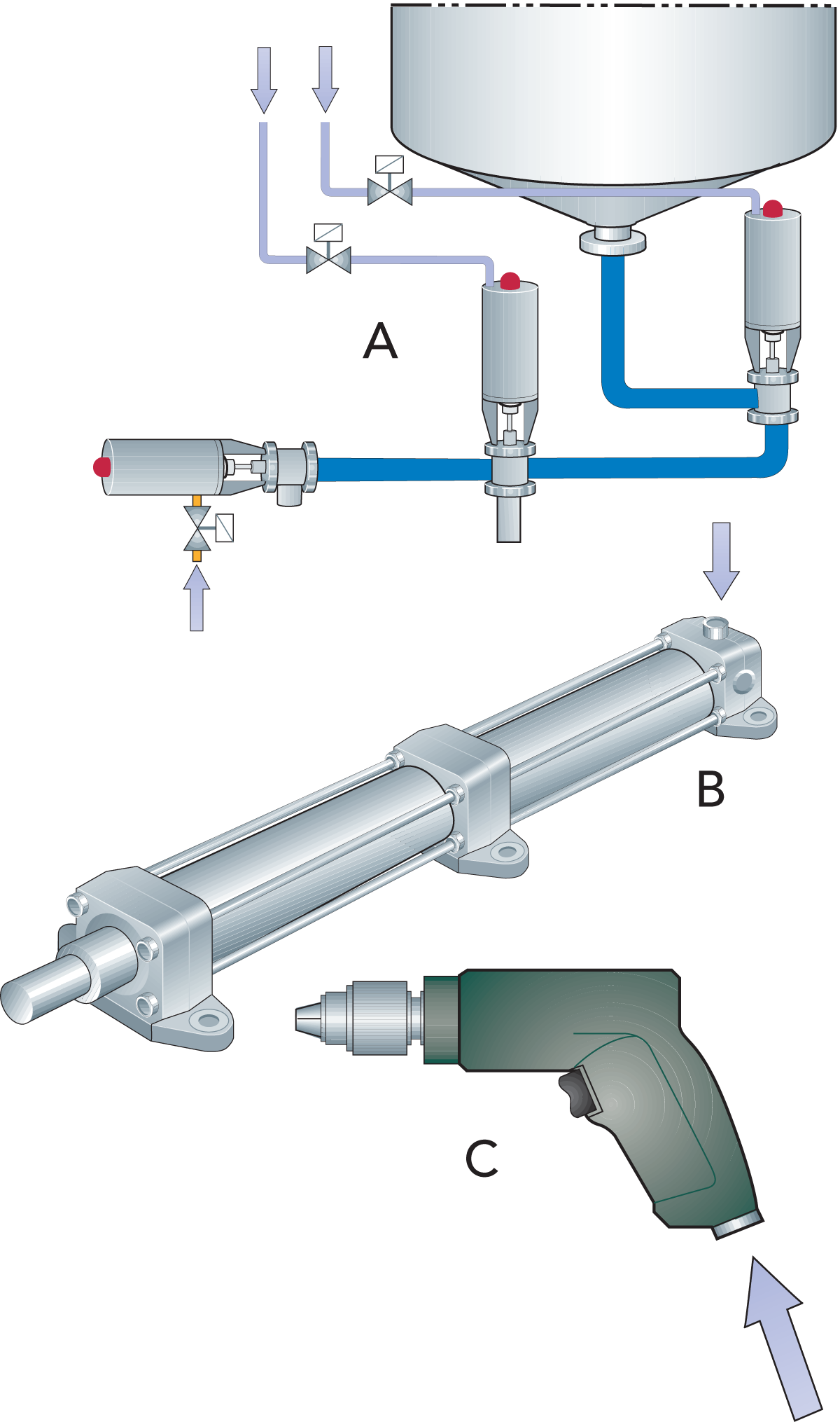 Pneumatikmaschinen in der Molkerei und der Werkstatt nehmen die größten Druckluftmengen auf. Diese Luft muss mit einem Druck von 600 kPa (6 bar) bereitgestellt werden, wofür ein Kompressor mit einem Betriebsdruck von 700 kPa (7 bar) nötig ist, um den Druckverlust im Verteilersystem auszugleichen. Druckluft mit einem geringeren Druck als dem für die Instrumentensteuerung oder als Antriebsquelle für Werkzeuge nötigen Druck wird nur in geringen Mengen benötigt. Es wäre daher unwirtschaftlich, hierfür einen eigenen Kompressor vorzuhalten, da dafür dann auch ein separates Luftleitungssystem nötig wäre. Daher wird die Druckluft für alle Anwendungen aus einer zentralen Kompressorstation entnommen und danach individuell behandelt, um den verschiedenen Anforderungen für ihren Einsatzzweck zu entsprechen.